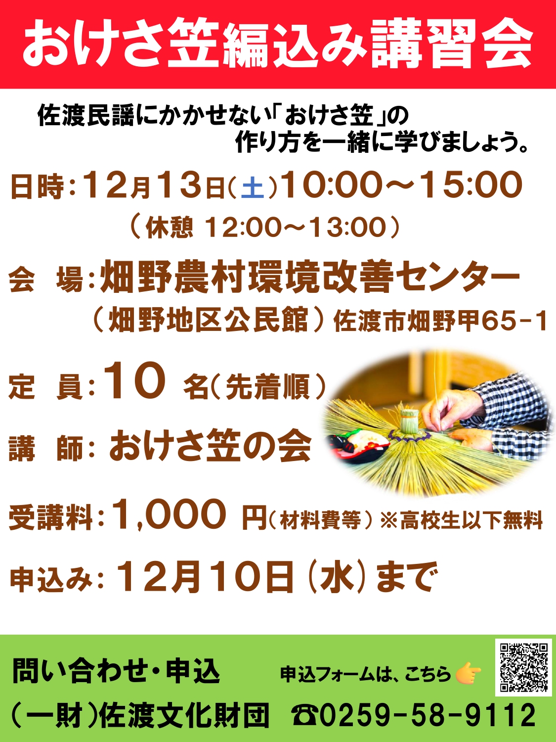 (日本語) 佐渡文化財団では、おけさ笠編込み講習会を下記の通り行います。